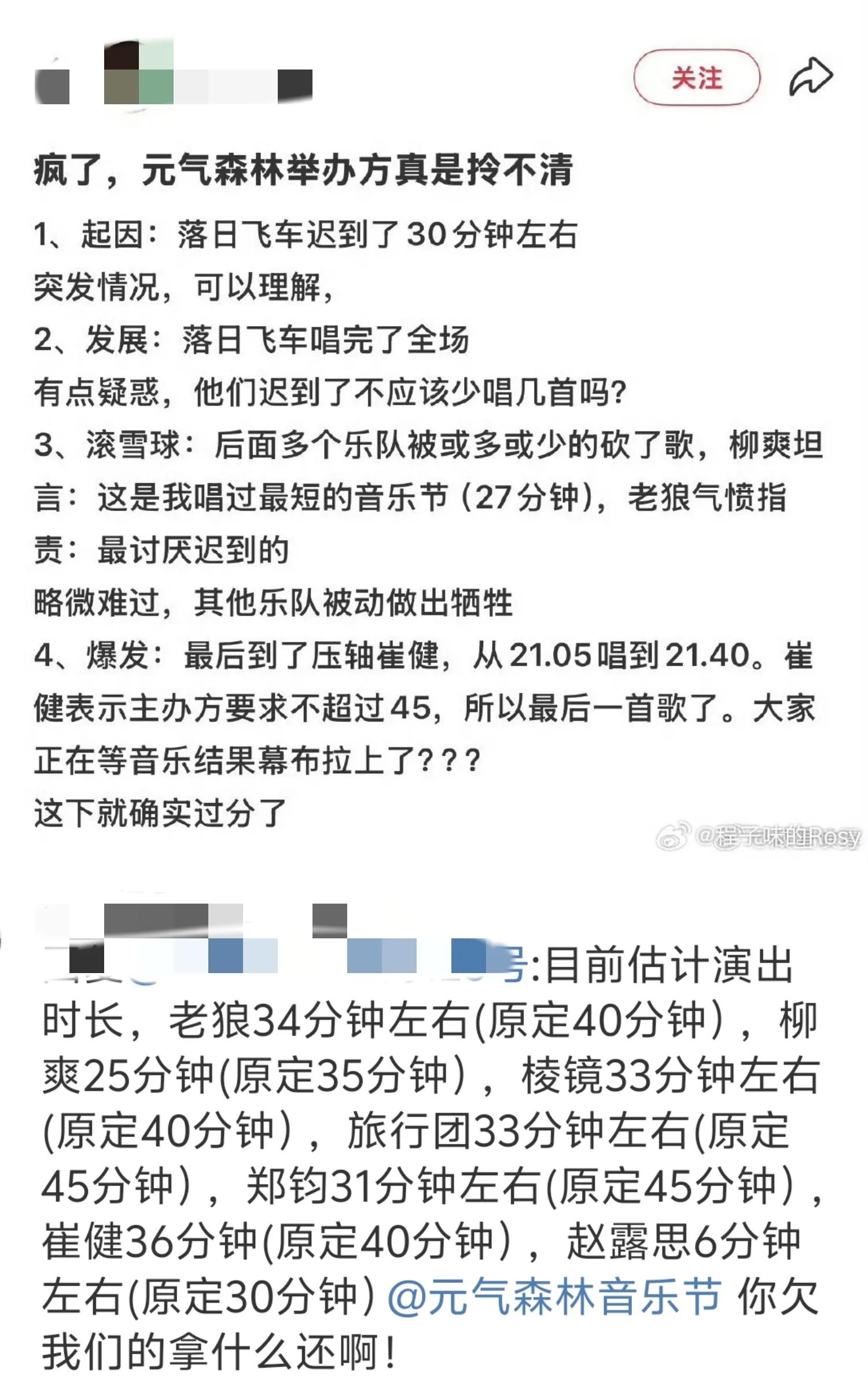 昨天“元气森林音乐节”发生严重演出事故了,因为中间有乐队迟到,导致后面至少有七个艺人的演出时间被砍,主办方被骂上热搜。