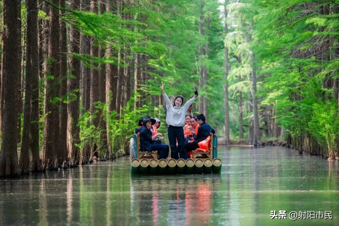 乘竹筏缓缓穿行于金湖水上森林