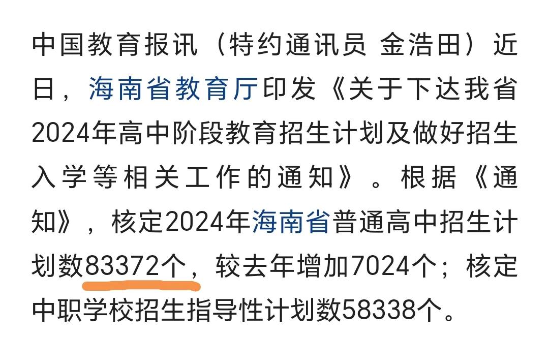 2022年海南省普通高中招生考试报名人数为124733人,普高招生计划核定数为72391人、占比约58%,“分流率”约42%。