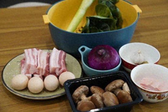带皮五花肉500g、猪皮200g、青菜、红葱头150g(可用洋葱代替)、葱、老姜、香菇若干(干香菇需提前泡发)、水煮蛋4颗、生抽50ml、老抽20ml、料酒、冰糖30g、五香粉1小勺、白胡椒粉1/2小勺、桂皮1小段、八角2颗、一锅米饭