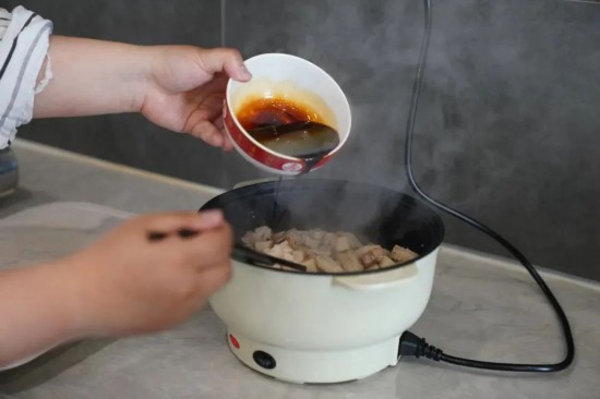五花肉煸至出现金黄色,观察锅中熬出的油量,如果不喜欢油腻的,可以将油撇出。此时,将生抽、老抽、料酒调成酱汁加入,翻炒上色。喜欢口味更浓郁的,还可以加入一块玫瑰腐乳。