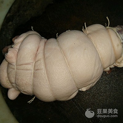 1、猪肘让档主帮忙去骨,洗干净,用棉线分段 将猪肘捆紧
