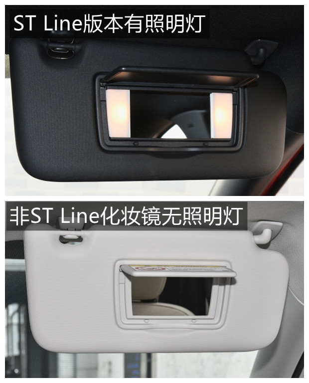 外后视镜方面全系标配电动调节和电动加热,但是除了锋跃型之外的其他车型有电动调节,电动加热,电动折叠,锁车自动折叠。内后视镜方面,ST Line版本带自动防眩目功能,这个功能是晚上从内后视镜看后面的车,不会被后面车的灯光照的看不清。车内化妆镜方面,主副驾全系都带化妆镜,但是只有ST Line版本带照明灯。