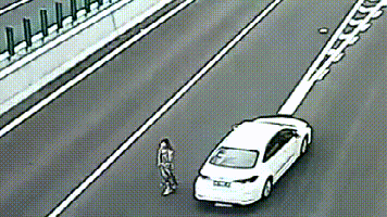 监控画面显示:10月8日下午4点30分许,一辆白色小车在高速主线出口附近,突然停车。该车随后晃晃悠悠往后倒,不久,车上下来一位女士,她全然不顾危险,在主线上来回走动,用手拦起了车……