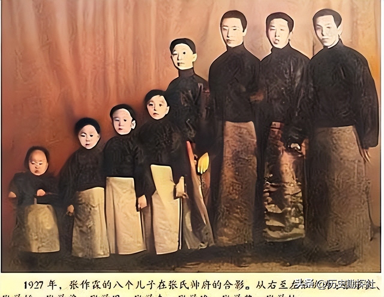 这是一张极具纪念意义的合影,画面中定格了张作霖与孩子们的温馨瞬间,张作霖稳坐中央,孩子们则环绕在他身旁,构成了一幅其乐融融、温馨美满的家庭画卷。