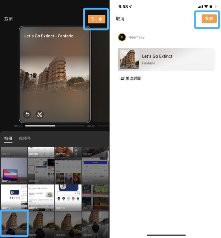 右下角则是「创作音乐视频」。当你收到其他好友分享的音乐时,则可以点击右上角的「…」看到「创作音乐视频」的入口。
