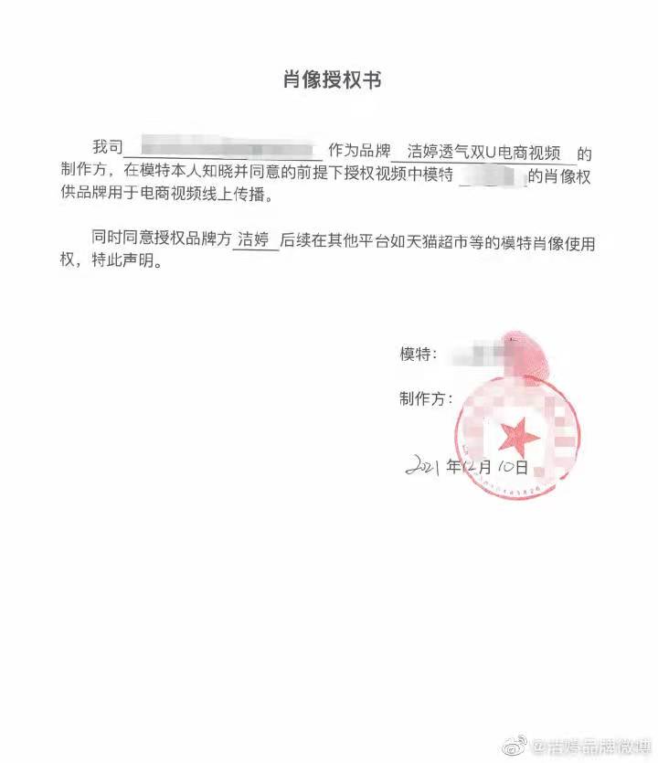 此外,在该条微博评论区,洁婷附上了模特肖像授权书。