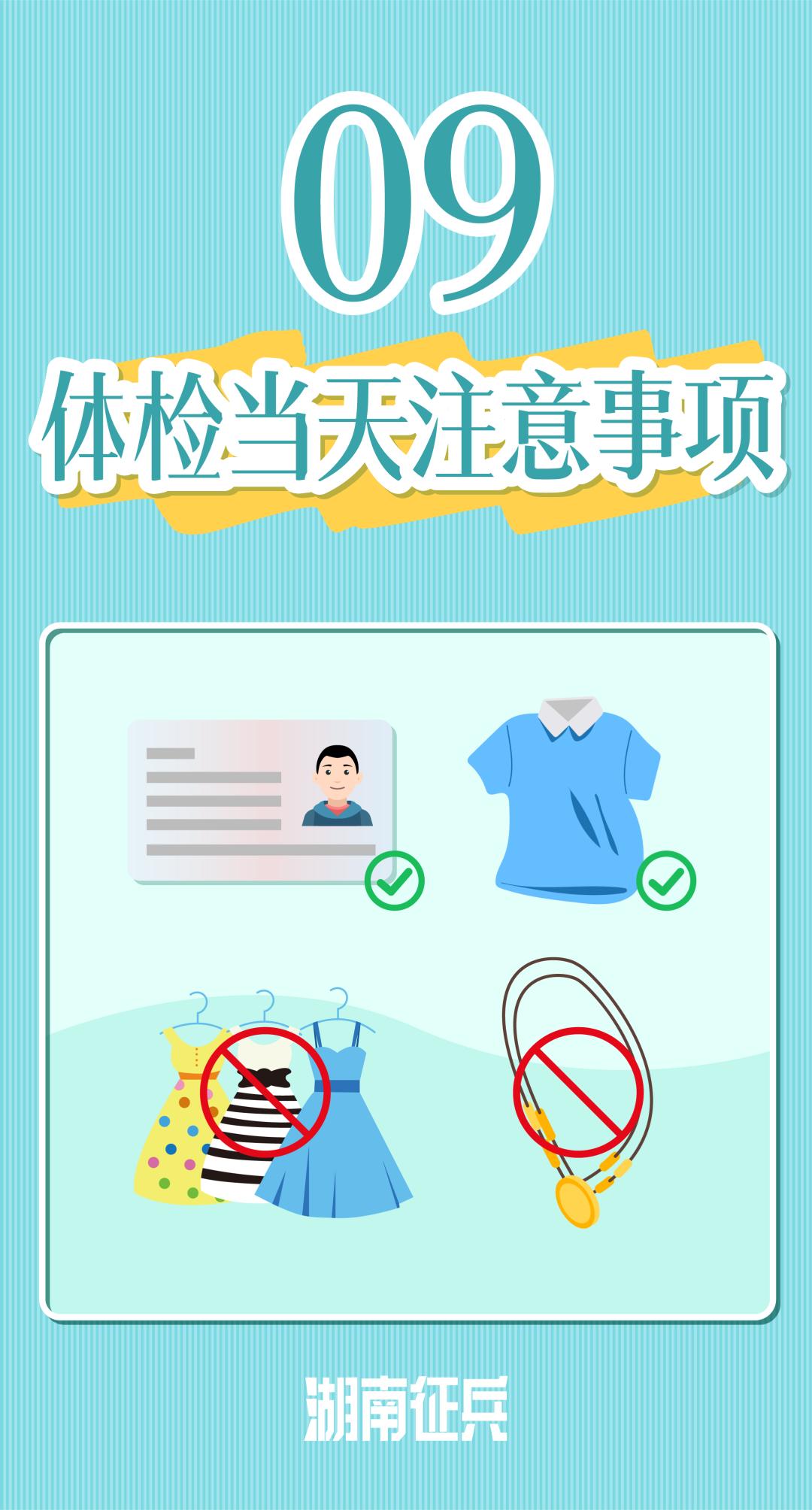 体检当天应随身携带好身份证、既往病历,穿戴简单宽松的衣物,女青年不能着裙装,不能戴耳环等首饰。做X线检查时,不要穿带有金属钮扣的衣服、文胸;需要摘去项链、手机、钢笔、钥匙等金属物品。体检当天空腹参检,兵役机关通常都会为大家准备食物,小伙伴们可以在抽血、肝胆胰脾B超检查完后,再进食进水。应征女青年若体检遇上经期,可申请参加复检,待经期结束后三天以上再复检。