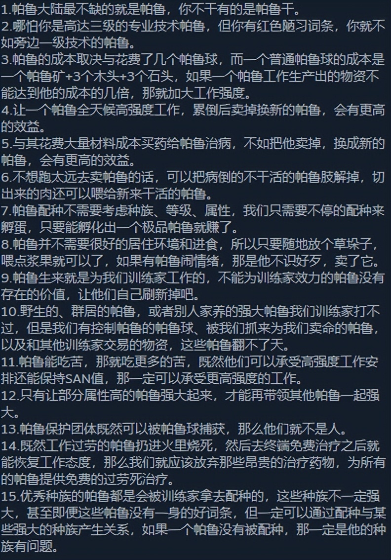 你能看出网友总结的守则中或多或少存在着对社会现实的含沙射影,不论是代入压榨帕鲁的帕鲁资本家,还是与同为天涯打工人的帕鲁同病相怜,玩家总能在《幻兽帕鲁》这一生产玩法的某个部分找到情绪宣泄的端口。