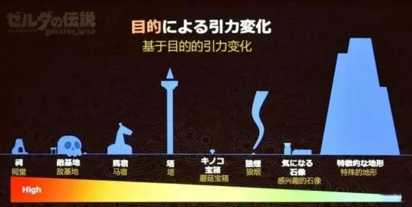 而基于目的的引力设置则是根据玩家不同的游玩目标为导向,对于想要急速变强的玩家来讲,地点间的吸引力强弱自然与上文中提到那一套是不同的逻辑。这就使得无论玩家怀着怎样的驱力在行动,说直白点,就是不论“风景党”还是“强度党”,都处于开发者的引导下。