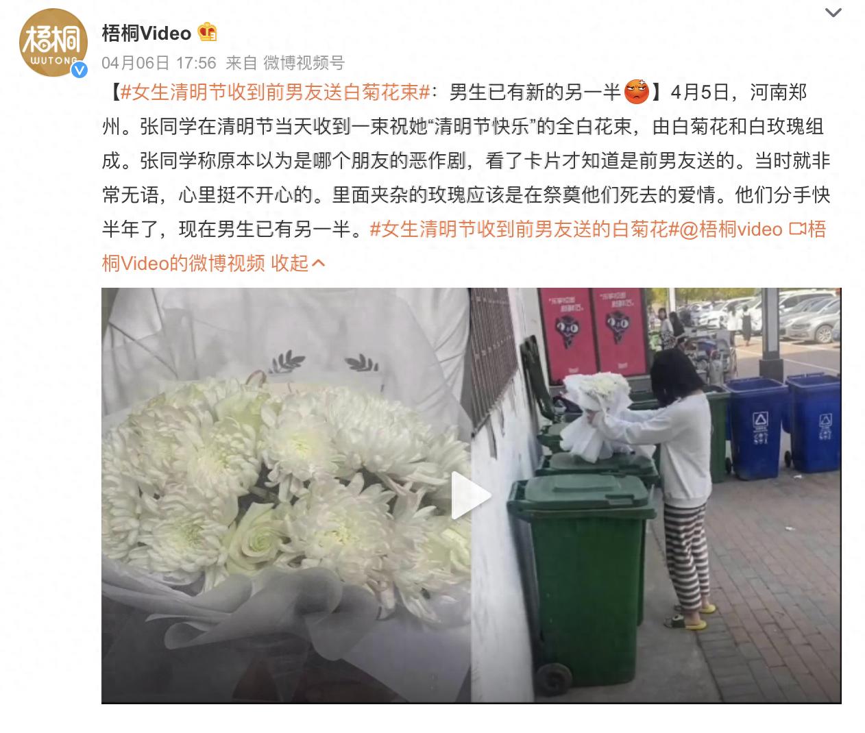 4月5日,河南郑州。一女生在清明节时收到了前男友送来的花束,没想到竟然是白色菊花和白色玫瑰,连包装纸都是白色。当事人张同学介绍:当时不知道谁送的花,看了卡片才知道是前男友,还挺无奈的。她把花扔进了垃圾桶,就当祭奠死去的爱情。