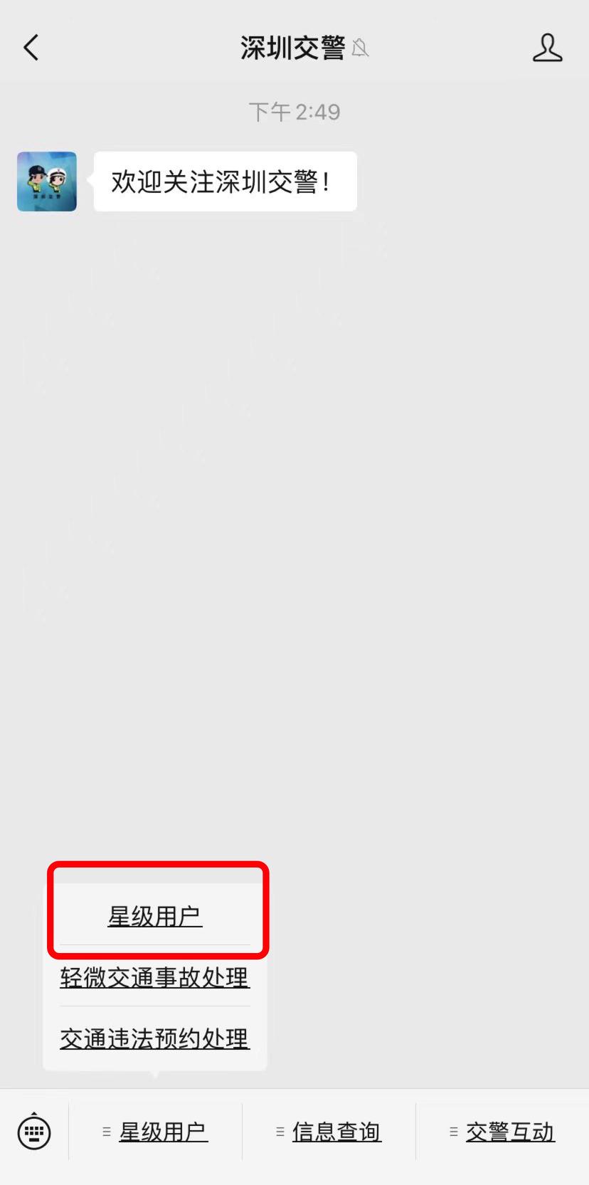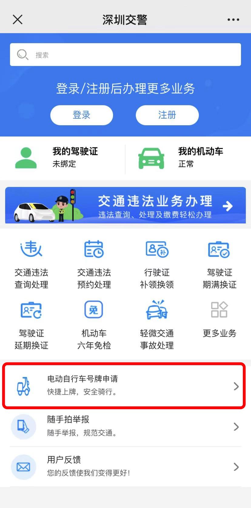 1、通过“深圳交警”微信公众号并登录“星级用户”模块,选择“电动自行车号牌申请”。