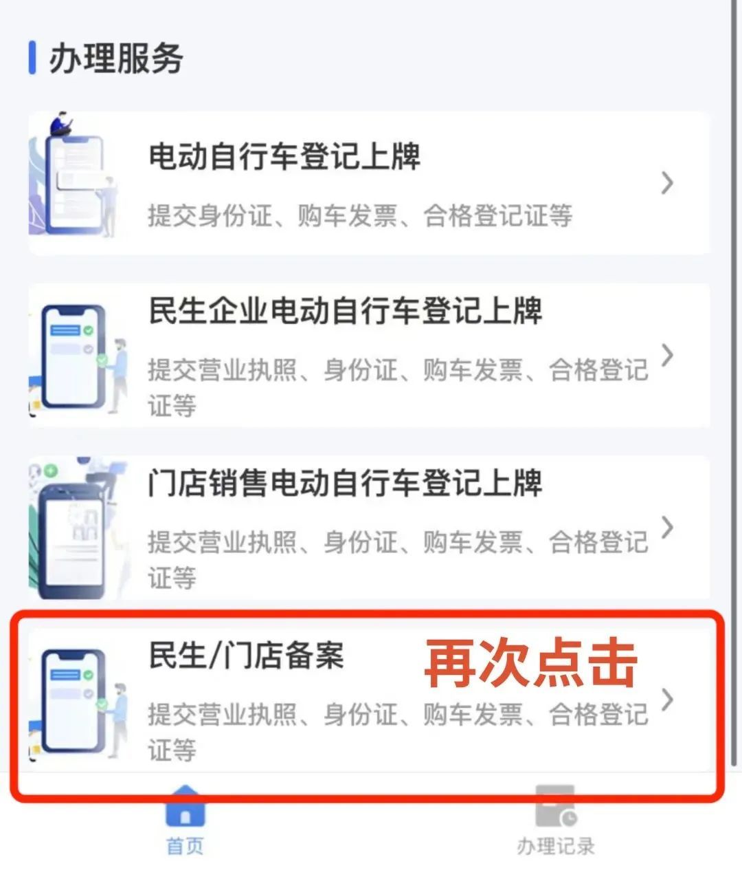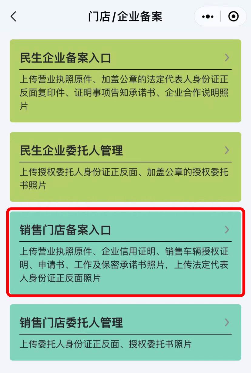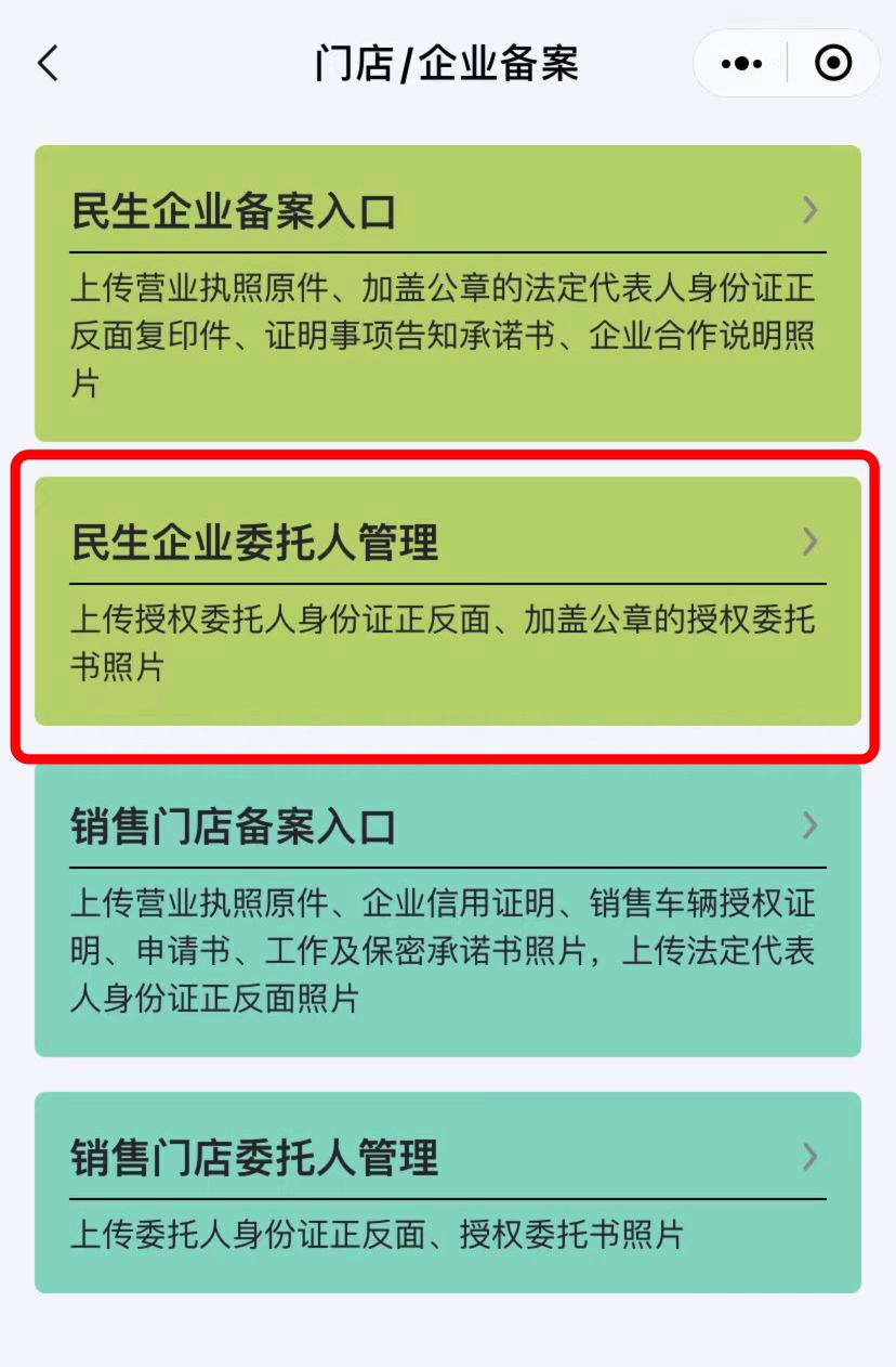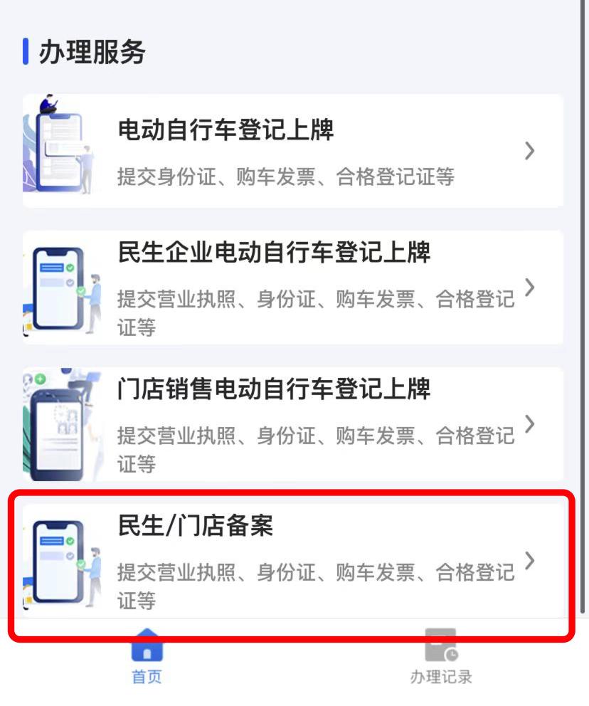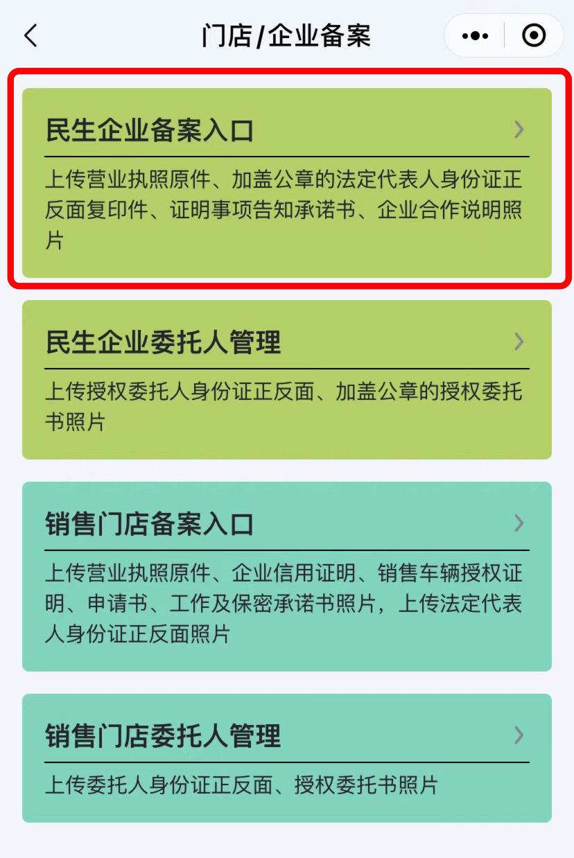 3、提交备案资料成功后,销售门店或民生行业便能根据系统提示获取相应权限。此时,“老板们”需再次点击进入“民生/门店备案”选项。
