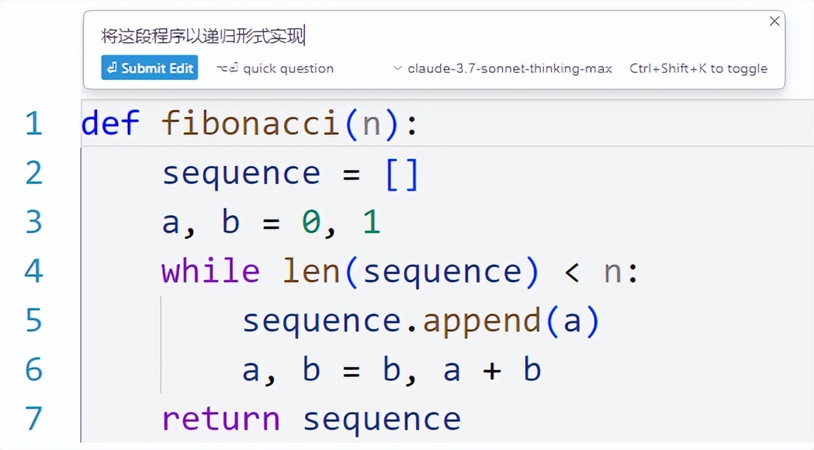 这里我让Cursor写一个Python斐波那契数列程序,且输出前10项,Agent模式提问后,会自动模拟终端运行,给出前10项的结果。