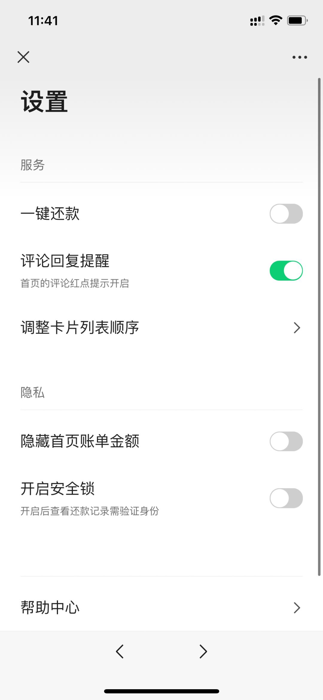 另外,在新版的信用卡还款页面还增加了「设置」页面,可以设置一键还款、隐藏首页账单金额、开启安全锁等功能。