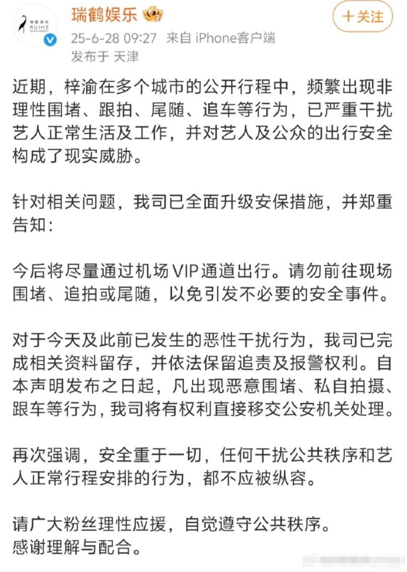 梓渝公司也发文称,已对恶性干扰行为留存取证,凡出现恶意围堵、私自拍摄、跟车等行为,将直接移交公安机关处理。
