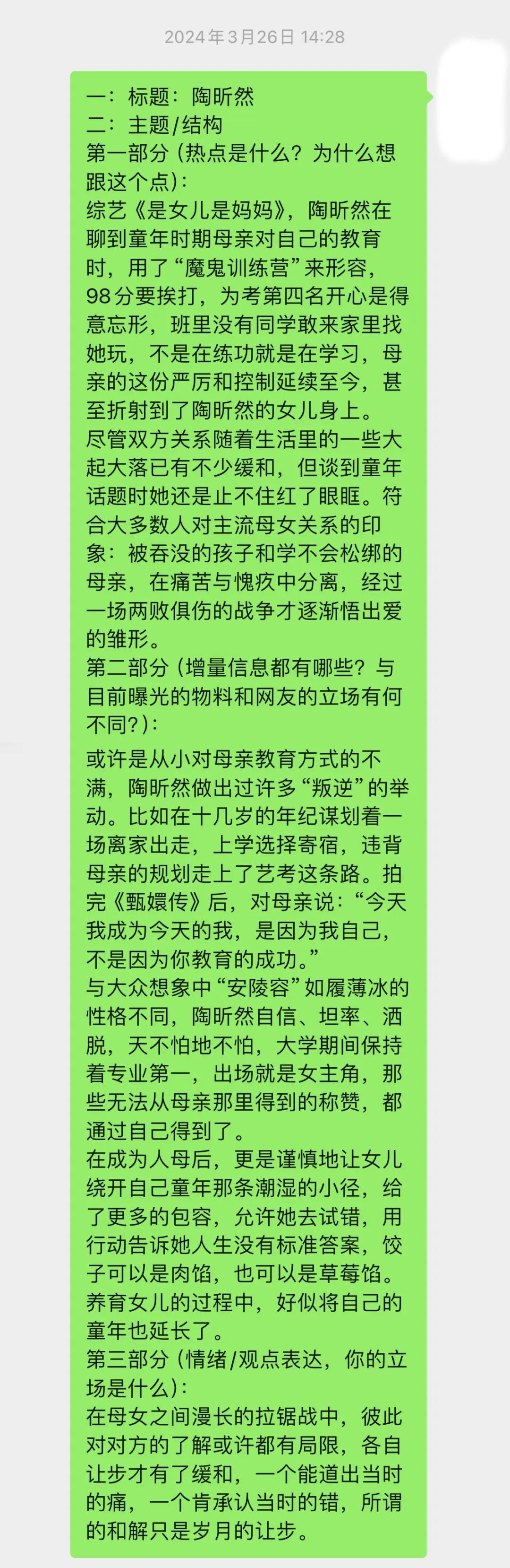 在看完两个小时的节目后,对陶昕然与母亲的相处模式有感而发,构思了选题。