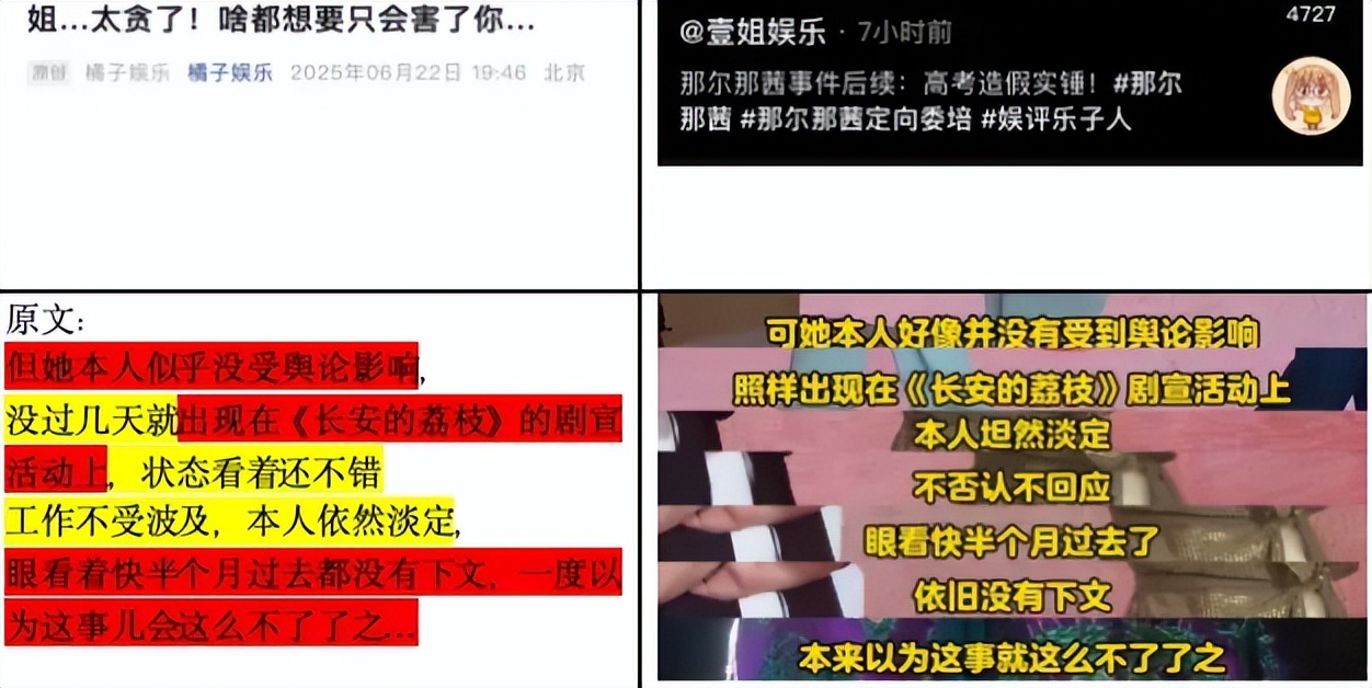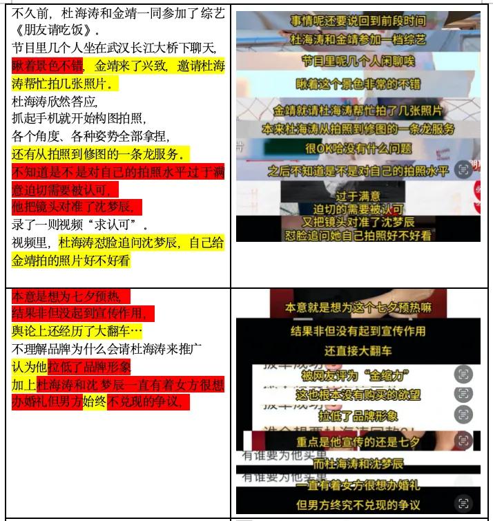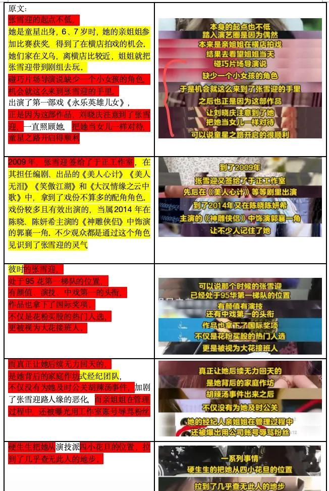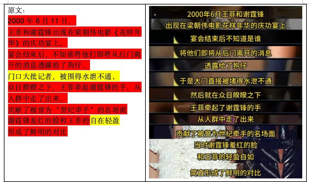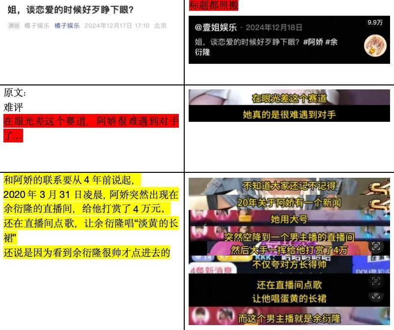 并且通过对比原文和视频文案可以看出,大量句子的表述同质化,仅有部分人称或无关副词的增减,细节表述几乎一模一样,均存在对橘子娱乐公众号文章的系统性抄袭。