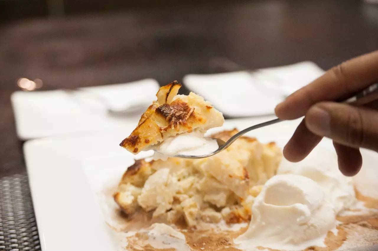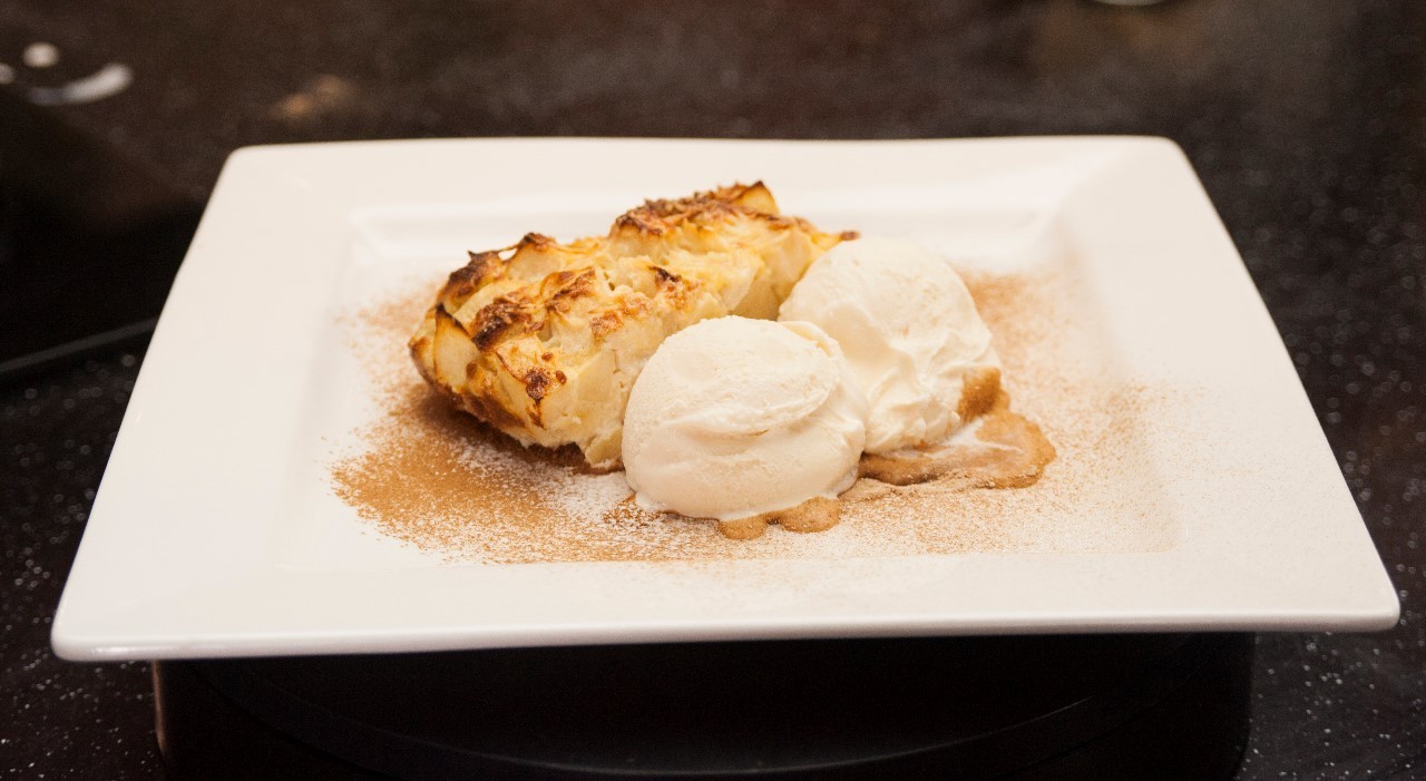 将2球冰淇淋装盘,放在苹果馅的旁边,就可以享用了。