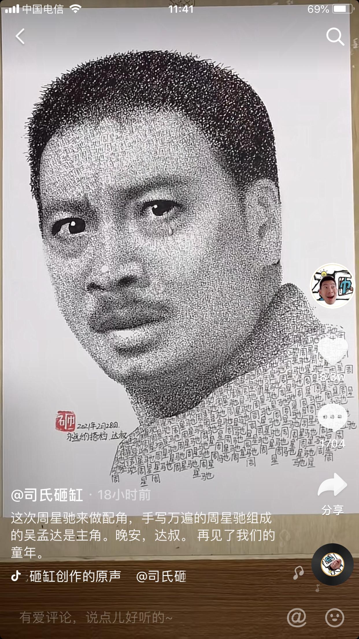 在抖音上,赵龙的人设是一个学习美术的高中生。但现实中,他是学了20年美术,教学了10年的美术老师。“我们教学生画素描头像,一上课,学生总睡觉,我就想可不可以用字表现头像。”他用一万个相同的名字或是符号描摹出名人的脸。