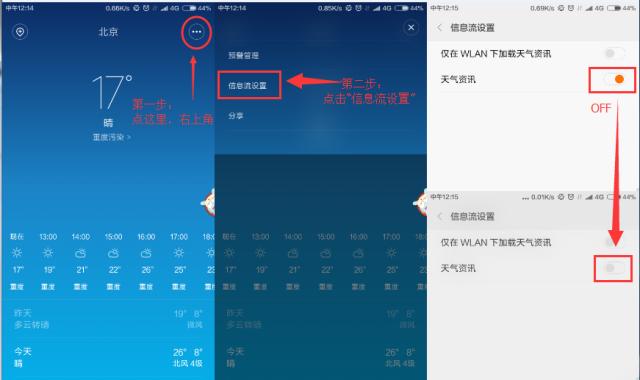 首先,打开天气后,在首页点击右上角,弹出下拉菜单,然后点击进入“信息流设置”,进入后“天气资讯”推送,只要把天气资讯关掉就不会有烦人的推送了!