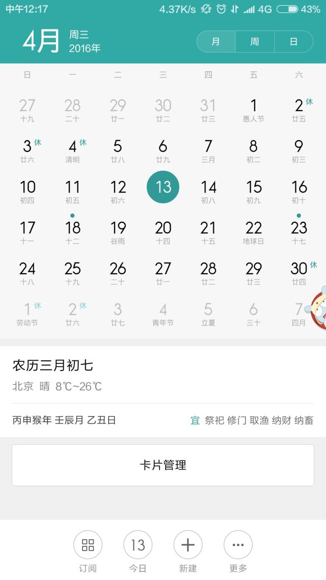 首先,打开日历后,在首页一直往下滑到底。直到出现“卡片管理”,点击进入后就能看到很多勾选上的卡片推送,只要把自己不想看到的资讯勾选掉!就会变得很清爽: