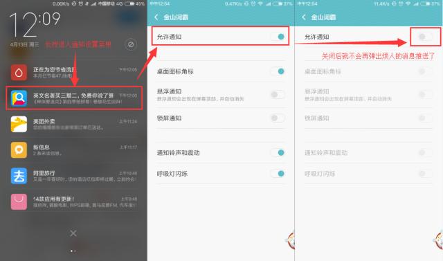 一样也可以关掉!只要你在通知栏中长按你不想看到的APP推送消息,就会弹出通知管理,只要把允许通知关掉!从此以后,它就不会再在通知栏中推送消息啦。