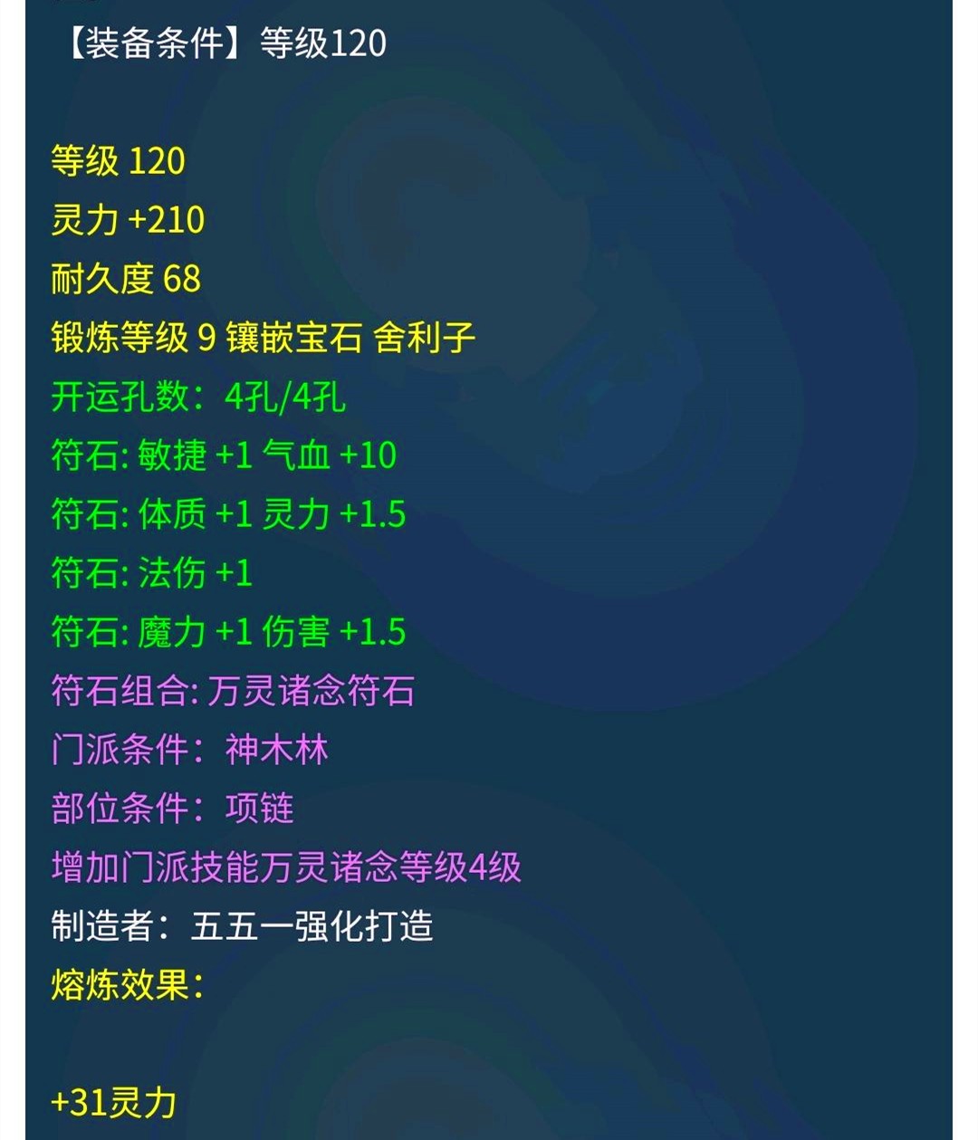看到上面这条120级的链子了吗?上面的这条120级的链子打满宝石以后的总灵力是可以达到259的,这样的一条链子在129级已经是可以用了,但是上面这套链子最大的亮点是这条链子的熔炼属性,上面这条链子的熔炼属性是增加了31点灵力。有玩家用凡人修仙来形容上面的这条链子,因为上面这条链子原本就是一个国标属性,结果却被融到了满灵,有的人说有可能是上面的这条链子原本是被当成垫子的,结果在当垫子熔炼的时候一直增加灵力,就融成了现在的这个结果。