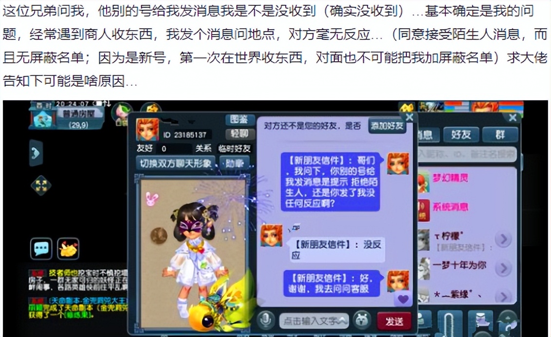上面这位玩家表示他新建的角色在游戏中喊话收东西的时候是收不到别人发过来的信息的,也就是有人想要卖东西,询问上面这位玩家坐标的时候他是看不到的,碰到上面这种情况时,上面这位玩家想知道怎么办。像这种情况在梦幻西游中确实是有可能会发生的,解决的方法目前还不是特别的明确,小编的建议是多次重新登录以后再尝试,实在不行就在喊话的时候直接说上交易的地点吧。