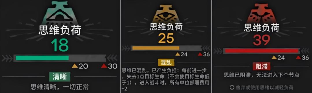 萨卡兹肉鸽的思绪系统,则像个负重有限的背包,玩家获取的每个思绪(道具)都有对应容量,所需容量越大、思绪品质越高,但玩家思维负荷有限,如果负荷值超出1.5倍则进入红色状态,玩家无法在节点上进行移动;
