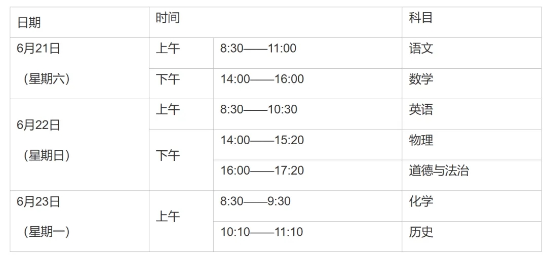 (1)笔试科目:语文、数学、英语、物理、化学、道德与法治、历史,共7科7卷。其中,道德与法治实行开卷笔试,其他科目均为闭卷笔试。语文科目为一卷制,其他科目为两卷制。各科目试卷满分值及考试时长分别为: