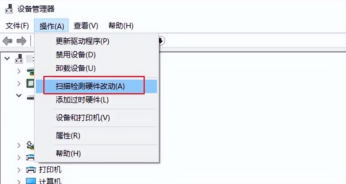 步骤3:操作完成后重启计算机,重新打开设备管理器应用,鼠标单击【操作】并选择【扫描检测硬件改动】选项。