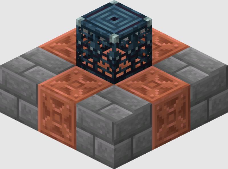 Minecraft的试炼刷怪笼与普通刷怪笼不同,试炼刷怪笼都是自带一个底座的。以旋风人为例,旋风人试炼刷怪笼的底座是一个3*3的基座,包含了铜块/雕纹铜块组成的十字,四个角的方块则是“雕纹凝灰岩”。