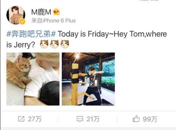 就算是跑男官方宣传。鹿晗依旧是带着心爱的猫咪一起上热门