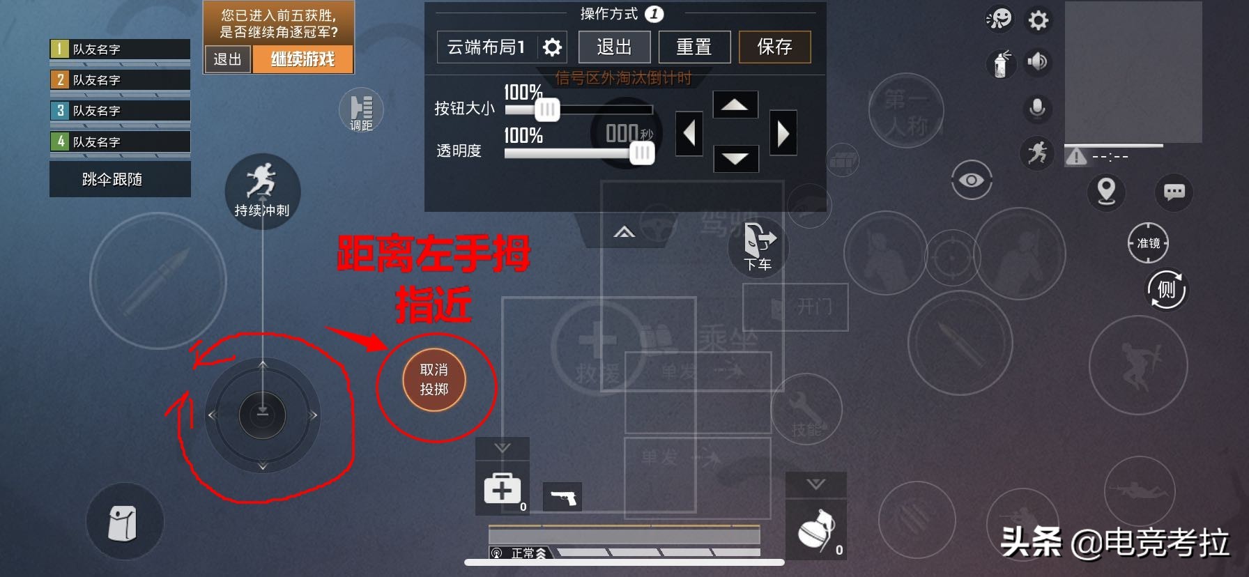 大家可别小瞧这个按键的位置设定,我曾经“有幸”因为这个键位设置的不当,导致出现被自己的雷炸死的情况,当初设置的位置靠屏幕右上方,左手扔雷还好,因为不需要移动,取消时直接右手点就行,但是在右手扔雷想要取消的时候,左手离取消键太远,移动的时候很难按到,通常我们扔的都是瞬爆雷,如果没有及时取消,直接自雷,所以从那以后“取消投掷”的键位就被我放到左手边了。