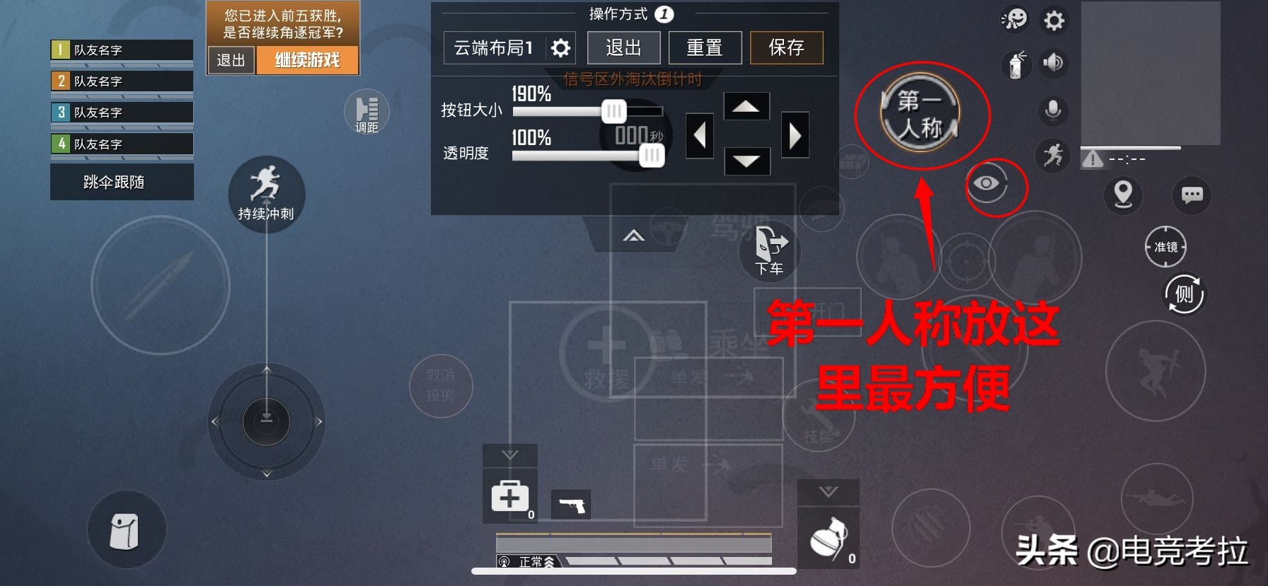 第一人称键的位置设置,我也是从一位主播那里学到的,原本的默认位置是挨着屏幕下沿,一个很不起眼的位置,不过随着自身技术的增加,对操作的要求变得颇高,攻楼和刚枪时有些人会切换到第一人称视角,转镜头更快,所以就给这个按键放到了默认小眼睛的上方,这样方便点到,至于我喜欢这个键位的原因是在载具追逐战的时候切换到第一人称视角射击,能提高命中率,我是亲身测试过的,还能快速在两个视角间切换。