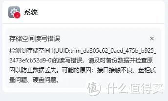 鼠标放上去,提醒当前存储空间可能存在硬盘接口接触不良或者文件系统故障。这一次,直接的表现是:刚用docker安装好的小雅alist,Syncthing这个应用提示无法启动,系统通知提醒存储空间读写错误,并提醒原因可能是:接口接触不良,盘柜质量问题,硬盘问题。