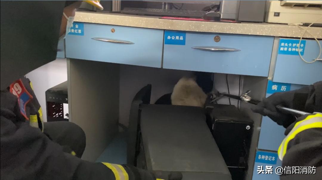 流浪狗躲在护士台桌子底下,
