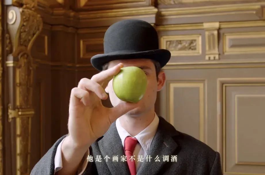 周董率先施法变出青苹果,代替了马格利特脸上的红鼻头,一顿操作就把马氏的创意据为己有。