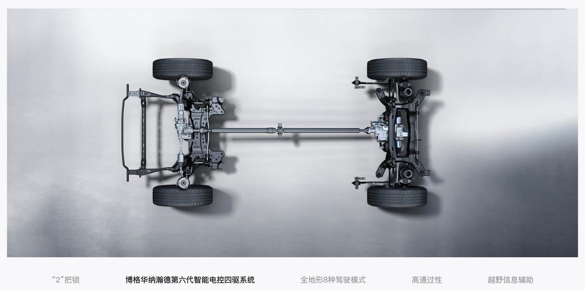 在四驱部分,四驱系统由五代升级成博格华纳瀚德第六代智能电控四驱系统,且配备有后桥牙嵌式机械差速锁。