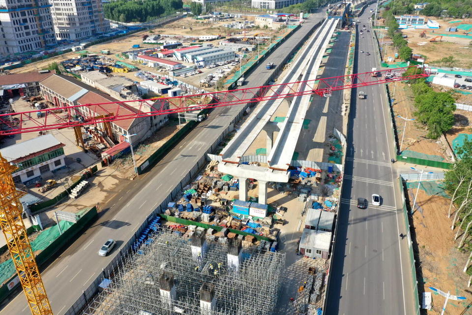 5月3日,航拍济南地铁8号线西段。这个位置是8号线轨道线路地上和地下部分的交界处,地铁线路从此处由地下跃出地面向东延伸。