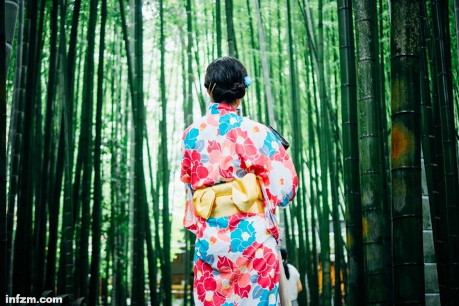 穿越竹林的日本少女,长发挽起,身着白底红花的和服,活泼可爱。(资料图/图)