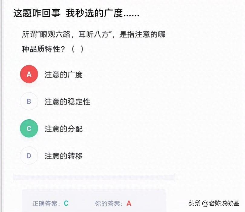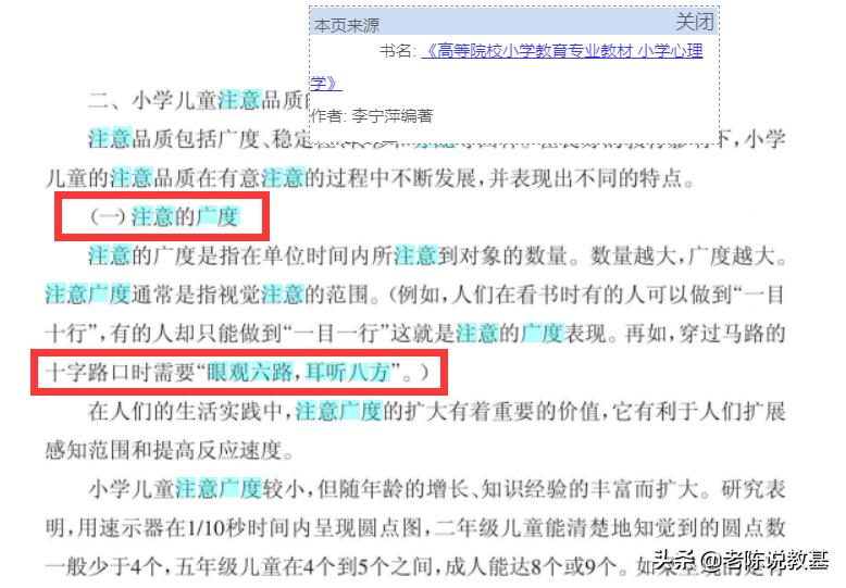 看到这个截图,小编有点头大,毕竟在教师资格证或者教师招聘考试中,这个题目可是很多老师给同学们做了好多分析的,还头头是道得对不对,比如有的教育机构的老师这样说,当这两个句子连用的时候(“眼观六路,耳听八方”)就体现的是注意的分配,当这两个句子不连用的时候(“眼观六路”“耳听八方”)就体现的是注意的广度,但是这些分析是个人理解呢还是真的确有其说呢?相信很多同学们都无从考证。关于上述的说法,小编用锃亮锃亮的头顶告诉你:其实是站不住脚的,小编这就给大家上两个图,让大家感受一下子。