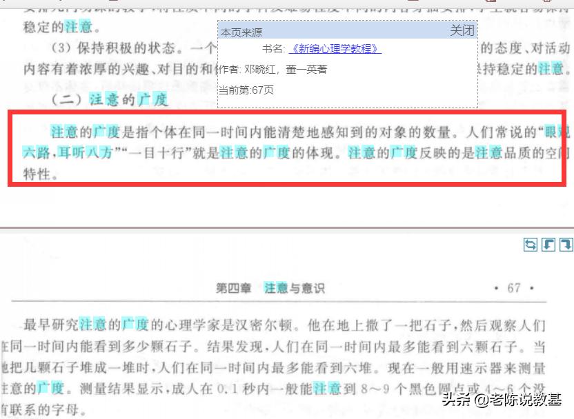 看到上面这个问题,小编为了说服大家呀,连夜翻遍了现有能够查到的资源,总共翻阅了从1986年到现在的80本(数的眼睛都快花了)各种版本的各学者出版的心理学教材关于这个命题的论述,最后发现绝大多数的教材上,包括华东师范大学心理学系教授、博士生导师梁宁建教授在他出版的《心理学导论》一书中,都认为“眼观六路耳听八方”都是属于注意的分配,只有仅仅10本教材上认为“眼观六路耳听八方”属于注意的广度,在这10本教材中,还有几本教材还不是纯心理学教材,小编带着大家一起来看看。