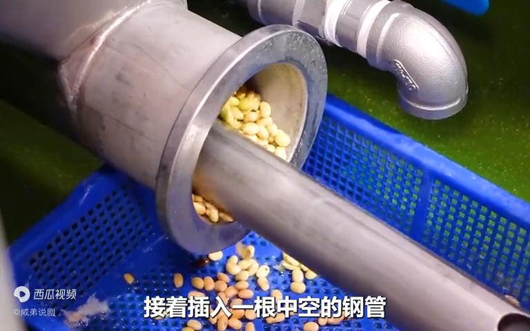 ·制作豆腐皮的第一步,首先将浸泡了一夜的黄豆清洗干净后,工人会打开底部的阀门,接着插入一根中空的钢管,黄豆顺着管子会被吸到这台工厂定制的大型磨煮浆一体机中。得益于现代工业的先进性,让一切繁重的流程变得简单且高效。
