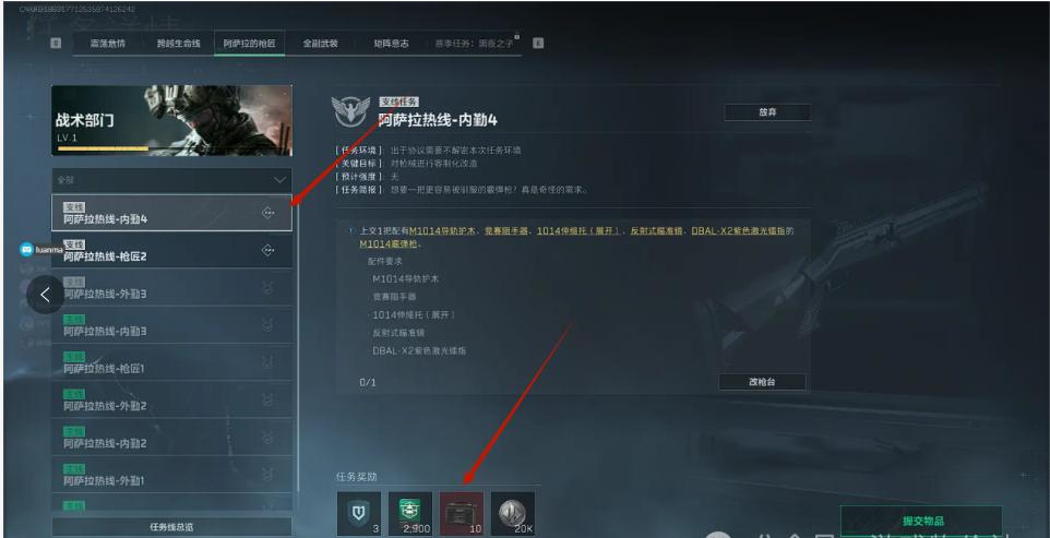 第三把,之前改枪任务ak74u改装,(记得提交任务),买头修甲修(跟上图一样还是在部门,军需处,医疗部门)(记得提交任务),让然后ak74u进图杀小兵,还有调查,拾取任务道具,出来领取任务奖励,然后交易行上架3个拍品,基本就8级了