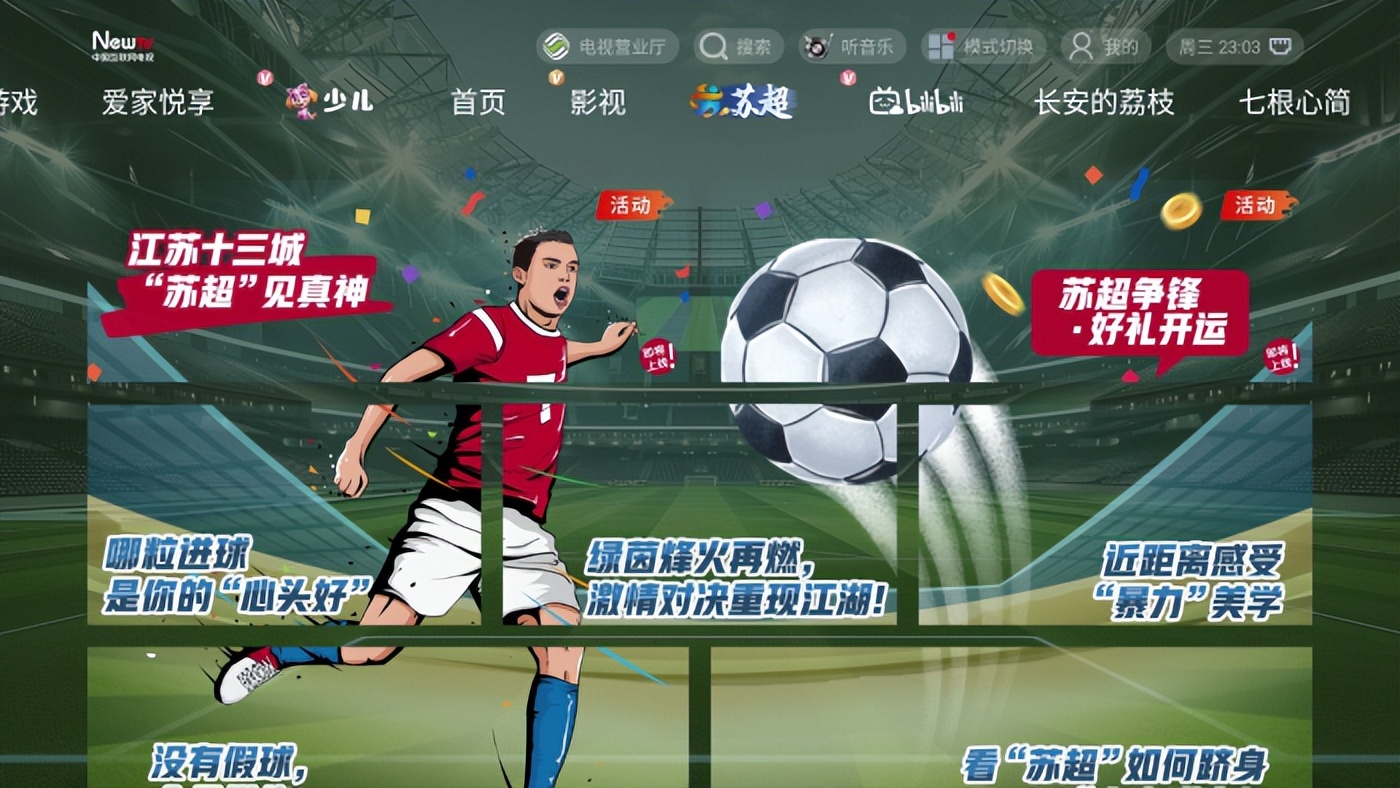6月13日晚,原本抢票失败有些懊恼的苏州市民王先生,一打开移动高清电视就看到了“苏超”专区,立即打电话告知好友这个消息,“‘苏超’是真火啊,移动高清电视上都有专区了,赛事回看、花絮都能看”。
