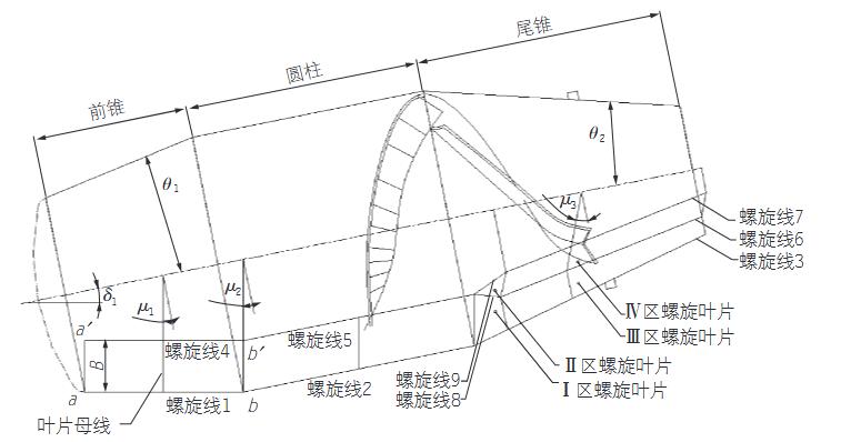 你以为搅拌车筒体有两条螺旋线,其实筒体内共设置了9条螺旋线,即前锥部分叶片叶根螺旋线(螺旋线1)和叶顶螺旋线(螺旋线4),圆柱部分叶片叶根螺旋线(螺旋线2)和叶顶螺旋线(螺旋线5),尾锥部分叶根螺旋线(螺旋线3)、叶中螺旋线(螺旋线6和螺旋线8)、叶顶螺旋线(螺旋线7和螺旋线9),其中螺旋线8和螺旋线9为圆柱部分与尾锥部分的过渡螺旋线。