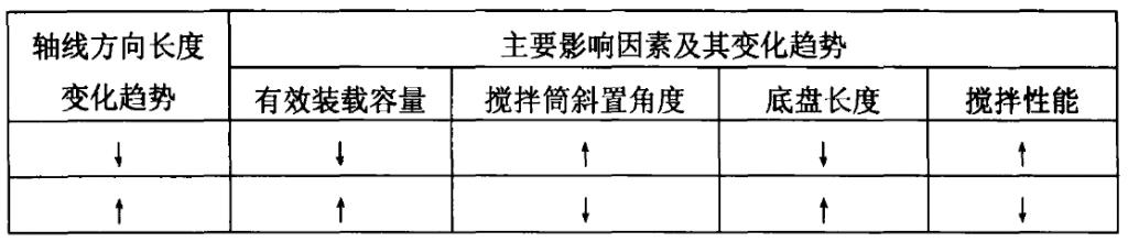 筒体沿轴线方向的长度应参考载重量,由己确定的中部最大直径、锥顶角等几何参数用计算辅助设计或手工绘图方法求得,但这一尺寸受选定汽车底盘长度的限制,应根据搅拌装置各组成部分(如水箱,专用发动机等)在上车的布局情况和支承点进行调整。轴线方向长度及其主要影响因素的相互影响见表所示。