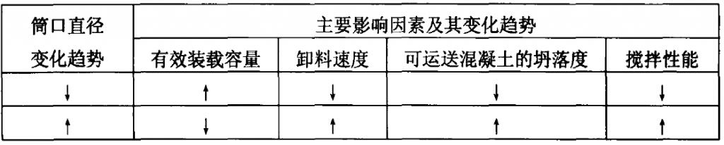 搅拌筒的筒口直径关系着对混凝土的吞吐速度,应根据搅拌筒的装载量和要求的卸料速度而定。搅拌筒要求的卸料速度是考虑配套使用的混凝土泵等一些现场输送浇灌机械的生产率或自身的生产等因素而制定。而搅拌筒的实际卸料速度又取决于拌筒的反转速度和混凝土的塌落度。其筒口直径由锥体锥角等因素综合求得。筒口直径及其主要影响因素的相互影响见表所示。